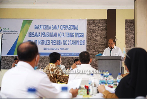 Deputi Direktur BPJS Ketenagakerjaan Wilayah Sumbagut Panji Wibisana dalam sambutannya menjelaskan, kegiatan ini adalah untuk benar-benar bagaimana negara hadir melindungi seluruh pekerja yang ada di Kota Tebingtinggi. Dan tentunya juga dapat kami laporkan bahwa ada Intruksi Presiden No.2 Tahun 2021 yang telah diberlakukan sejak tanggal 1 April ini.