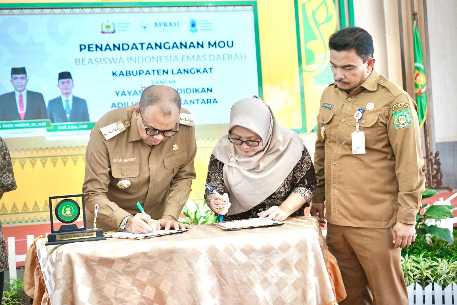 Bupati Langkat H. M. Faisal Hasrimy, AP., M.AP Tandatangani MoU dan Kerjasama dengan Yayasan Adihulung Pendidikan Nusantara untuk Program Beasiswa Indonesia Emas Daerah (BIE-D) dalam negeri dan luar negeri di Pendopo Jentera Malay Rumah Dinas Bupati, Selasa (04/06/2024) pagi.