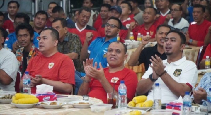 Ratusan masyarakat antusias nonton bareng bersama Forkopimda Langkat antara Timnas U-23 Vs Uzbekistan U-23 bertempat di Jentera Malay Rumah Dinas Bupati Langkat, Senin (29/4/2024) malam.