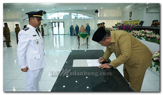 Wakil Bupati Asahan Taufik Zainal Abidin Siregar, S. Sos, M. Si mengambil sumpah dan melantik Pejabat Administrator, Pengawas, Fungsional Penyetaraan dan KTU Puskesmas di Lingkungan Pemerintah Kabupaten Asahan, Rabu (01/02/2023).