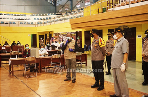 Walikota Tebing Tinggi Ir. H. Umar Zunaidi Hasibuan, M.M. bersama Kapolres AKBP. Agus Sugiyarso, S.IK, Kadis Kesehatan dr. Nanang Fitra Aulia, Sp.Pk, Kadis Kominfo Dedi Parulian Siagian, S.STP, M.Si serta Kepala BPBD Wahid Sitorus, meninjau langsung proses suntik vaksinasi massal Covid-19 terhadap masyarakat Kota Tebing Tinggi yang lanjut usia (lansia), di GOR Asber Nasution, Jl. Gn. Leuser, Kamis (27/05/2021).