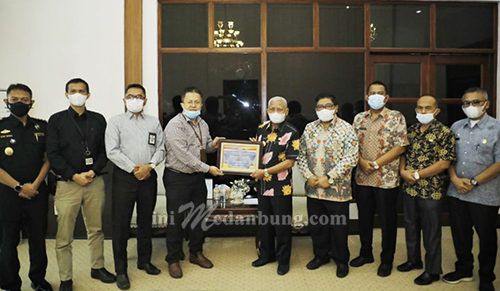 Kepala Kantor Pelayanan Perbendaharaan Negara (KPPN) Tanjung Balai Fedrioka Kasmar didampingi Kepala Kantor Pelayanaan Kekayaan Negara dan Lelang (KPKNL) Kisaran Agus Budianta, Kepala Kantor Pelayanan Pajak (KPP) Pratama Kisaran Maman Surahman dan Kepala Kantor Bea Cukai Teluk Nibung Tutut Basuki menyerahkan piagam penghargaan dari Pemerintah RI melalui Kementerian Keuangan RI kepada Pemerintah Kabupaten Asahan yang diterima langsung Bupati Asahan H. Surya, BSc di Ruang Kerja Bupati Asahan atas keberhasilannya menyusun dan menyajikan Laporan Keuangan Tahun 2020 dengan capaian Opini Wajar Tanpa Pengecualian (WTP), Kamis (16/12/2021).