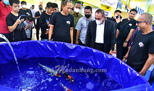 Medorong usaha budidaya dan bisnis ikan koi di Sumatera Utara (Sumut), Gubernur Sumut Edy Rahmayadi membuka Sumut Koi Show 2022 di GOR Mini Futsal Dispora Sumut, Jalan Willem Iskandar, Medan, Sabtu (23/7/2022).