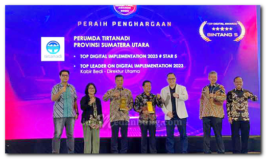 Perumda Tirtanadi kembali berhasil meraih Top Digital Implementation di tahun 2023 dengan predikat Bintang 5, sementara Direktur Utama (Dirut) Kabir Bedi berdasarkan penilaian dari majalah IT Work berhasil “menyabet” predikat Top Leader on Digital.