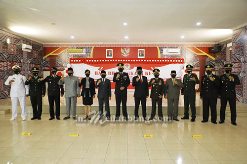 Bupati Asahan H. Surya, B. Sc. mengkuti Upacara Hari Ulang Tahun (HUT) ke-75 Bhayangkara bersama Kapolres Asahan, Ketua DPRD, Kajari, Ketua PN, Dandim 0208/AS (mewaki), Danlanal TB/AS (mewakili) Danyonif 126/KC (mewakili) dan beberapa perwira sejajaran Polres Asahan secara Virtual, Kamis (1/7/2021) di Aula Wira Satya Polres Asahan.