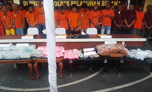 Plh. Kapolres Pelabuhan Belawan AKBP Wahyudi Rahman merinci barang bukti yang diamankan yaitu 28,74 klg sabu, 41.396 butir Pil ekstasi, 13 kg Ganja, 34 saset Happy Water dan 150 cartridge Liquid vape mengandung etomidate.