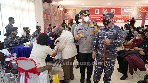 Kapolres Asahan AKBP Putu Yudha Prawira SIK.MH. bersama Danlanal Tanjung Balai Asahan Letkol Laut (P) Robinson Hendrik Etwiory, S.E meninjau langsung Serbuan Vaksinasi TNI/Polri terhadap masyarakat Kabupaten Asahan di gelar di lokasi Gedung Aula Wira Satya Polres Asahan, Kamis (16/09/2021) Siang.