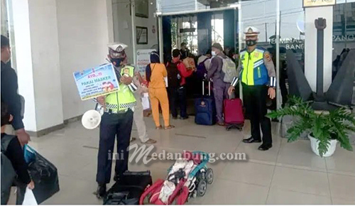 Personil Dikyasa memberikan himbauan kepada masyarakat penumpang KM Kelud di Terminal Bandar Deli Belawan melalui papan himbauan serta melakukan tentang Prokes dari pemerintah dan Peraturan berlalu lintas demi memutuskan mata rantai virus covid-19 untuk kepentingan dan keselamatan bersama dan mencegah terjadinya kecelakaan lalu lintas khususnya di wilayah hukum Polres Pelabuhan Belawan.