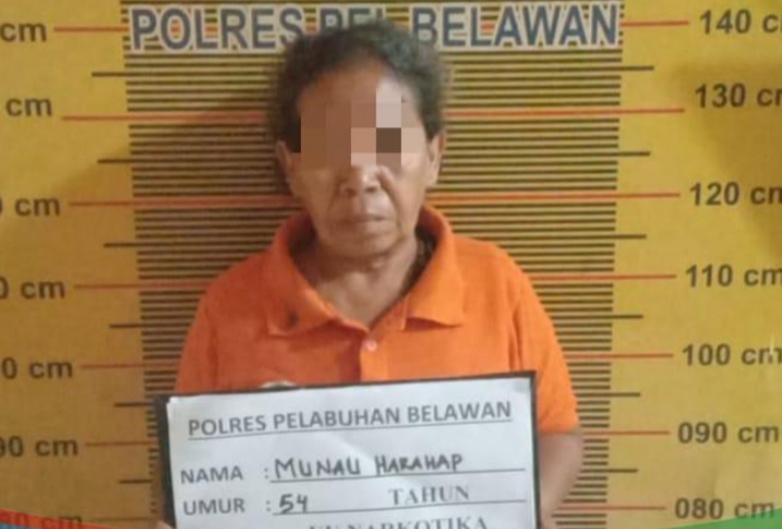 Tersangka yang diamankan seorang wanita Munau Harahap (54) saat rumahnya digerebek. Dalam penggrebekan tersebut, petugas menyita barang bukti berupa empat plastik klip besar berisi sabu sabu, satu unit ponsel dan satu buah kotak rokok.