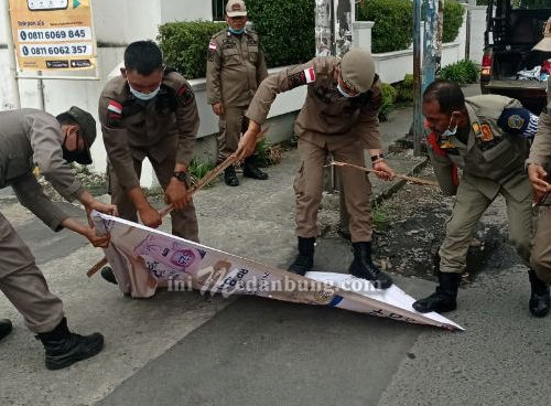 Satuan Polisi (Satpol) Pamong Praja (PP) Sumatera Utara (Sumut) dan Kota Medan melakukan penertiban reklame yang dipasang di pohon, tiang listrik dan tiang telepon di berbagai kawasan di Kota Medan, Kamis (4/3/2021).