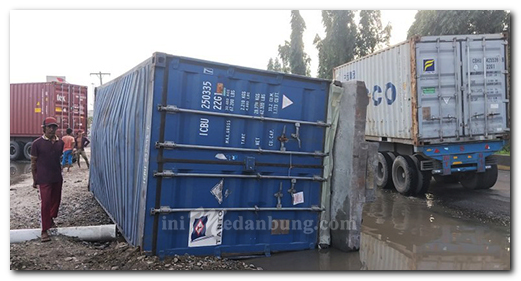 Akibatnya truk pengangkut continer tersebut terbalik dan melintang ditengah jalan, ratusan kendaran roda 4, roda 2 yang baru pulang kerja dari Pelabuhan Peti Kemas Gabion Belawan dan dari Pelabuhan Perikanan tidak bisa melintasinya.