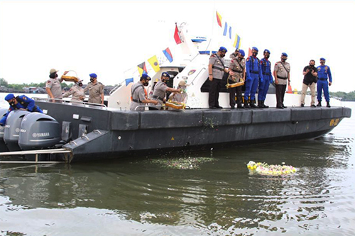 Menyambut Hari Ulang Tahunnya yang ke 70 Tahun 2020 Satuan Polairud Polda Sumatera Utara menabur dan melarung bunga di perairan Laut Belawan, Jumaat pagi (27/11/2020.)