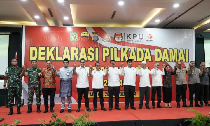 Kegiatan yang juga dihadiri pimpinan partai politik, organisasi kemasyarakatan, agama, kepemudaan itu ditandai pembacaan dan penandatanganan naskah Deklarasi Pilkada Damai Kota Medan oleh ketiga pasangan calon, yakni Rico Tri Putra Bayu Waas dan Zakiyuddin Harahap, Prof. Ridha Darmajaya dan Abdul Rani dan H.Hidayatullah dan H.A. Yasir Ridho Lubis. Turut menandatangani naskah deklarasi itu Plt. Wali Kota dan unsur Forkopimda Medan.