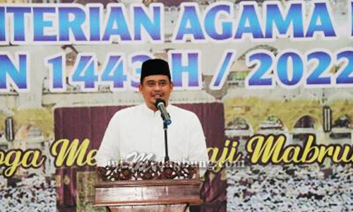 Wali Kota Medan Bobby Nasution berpesan kepada 1.077 jemaah calon haji (calhaj) asal Kota Medan agar fokus dalam melaksanakan seluruh ibadah haji. Sebab, jajaran kecamatan dan kelurahan diminta untuk menjaga keluarga dan rumah yang ditinggalkan para calhaj selama menjalankan seluruh rukun haji tersebut. “Tetap fokus dalam melaksanakan seluruh ibadah haji dan yakinlah Allah SWT juga akan menjaga keluarga yang ditinggalkan,” kata Bobby Nasution saat membuka Bimbingan Manasik Haji Akbar Tahun 1443 H/2022 yang diselenggarakan Kantor Kementerian Agama Kota Medan di Aula Madinatul Hujjaj Asrama Haji Medan Jalan AH Nasution Medan, Sabtu (4/6/2022).