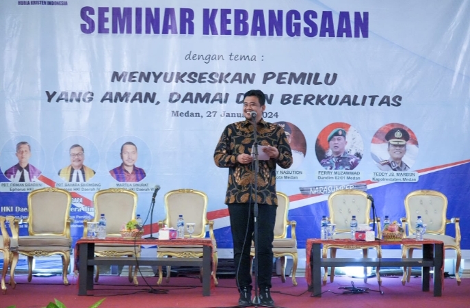 Ajakan ini disampaikannya dalam Seminar Kebangsaan yang digelar HKI, Sabtu (27/1) di Danau Toba Internasional Hotel. “Pemilu yang aman, damai, dan berkualitas adalah tujuan yang harus kita capai bersama, baik penyelenggara, pemerintah, TNI/Polri, pemuka agama, dan seluruh masyarakat.” ungkapnya di hadapan seribuan jemaat HKI.