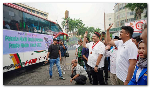 Wali Kota Medan Bobby Nasution melepas warga Kota Medan yang mengikuti Mudik Gratis Bareng Pemko Medan 2023 di hari kedua dari Jalan Masjid Raya Medan, Kamis (20/4/2023) siang. Dengan program yang digagas sejak tahun lalu ini, menantu Presiden’ Joko Widodo ini berharap masyarakat dapat berkumpul dengan keluarga di kampung halaman untuk merayakan Hari Raya Idul Fitri 1444 H.