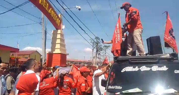 Aksi massa PBB berorasi di depan pintu gerbang Polres Pelabuhan Belawan. (rompas)