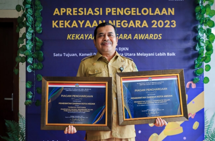 Kedua piagam penghargaan tersebut diterima Wali Kota Medan Bobby Nasution diwakili Kaban BKAD Zulkarnain dari Kepala Kanwil DJKN Sumut, Dodok Dwi Handoko dalam ajang Kekayaan Negara (KN) Award yang digelar Direktorat Jenderal Kekayaan Negara (DJKN) Sumut di Aula Gedung Kekayaan Negara, jalan Diponegoro, Medan, Selasa (5/12/2023).