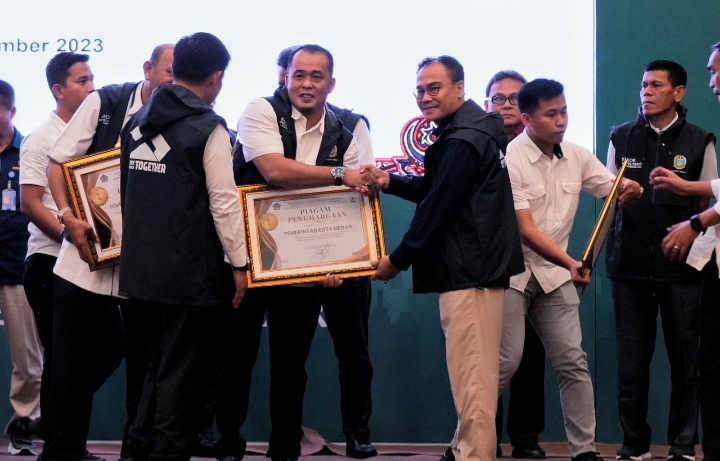 Penghargaan tersebut diserahkan langsung oleh Pj Gubernur Sumatera Utara, Hassanuddin kepada Wali Kota Medan, Bobby Nasution diwakili Wakil Wali Kota Medan, H. Aulia Rachman dalam acara rapat koordinasi Pembangunan Sumatera Utara Tahun 2023 di Hotel Santika Dyandra Medan, Rabu (13/12/2023).