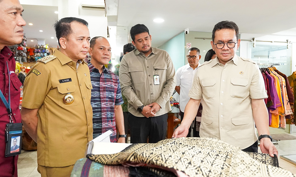Penjabat (Pj) Gubernur Sumatera Utara (Sumut) Agus Fatoni bersama Menteri Perdagangan (Mendag) Budi Santoso meninjau berbagai hasil produk unggulan UMKM dari Sumut. Mereka meninjau Galeri Ulos Sianipar yang berlokasi di Gang Pendidikan, Jalan AR Hakim, Medan, Sumut, Selasa (17/12/2024).