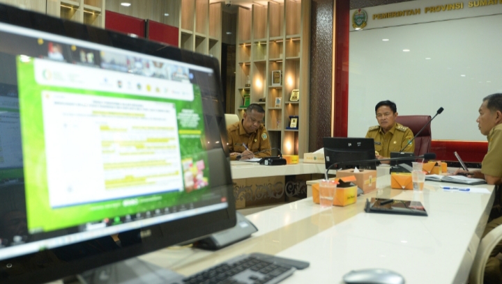Penjabat (Pj) Gubernur Sumatera Utara (Sumut) Hassanudin mengikuti Rapat Koordinasi (Rakor) Pengamanan dan Harga Pangan Jelang Ramadan dan Hari Raya Idulfitri, yang diselenggarakan Badan Pangan Nasional (Bapanas) secara virtual dari Lantai 6 Kantor Gubernur Sumut, Jalan Diponegoro Nomor 30 Medan, Senin (4/3/2024).