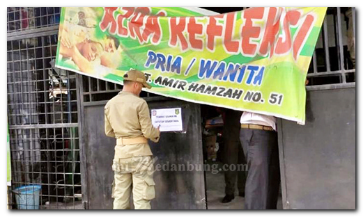 Tim Gabungan Pemko Medan yang terdiri dari petugas Satuan Polisi Pamong Praja (Satpol PP), Dinas Pariwisata, Dinas Kominfo, Bagian Tata Pemerintahan dan Bagian Hukum Setdako Medan, Senin (17/4/2023) menyegel panti pijat Azra Relfeksi di kawasan Jalan Amir Hamzah. Panti pijat di Kelurahan Helvetia Timur, Kecamatan Medan Helvetia, kedapatan beroperasi di bulan Ramadan.