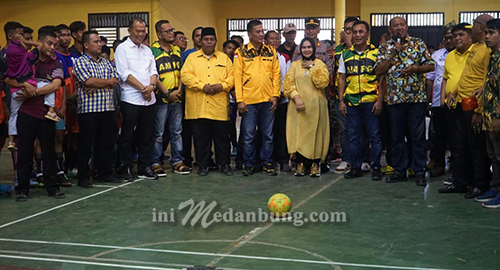 Pelaksana Tugas (Plt) Bupati Langkat H Syah Afandin SH menghadiri turnamen futsal AMPG (angkatan muda partai Golkar) untuk tingkat SMA sederajat dan Usia 21 memperebutkan Piala Bupati Langkat ,di GOR Langkat, Stabat, Sabtu (20/8/2022).