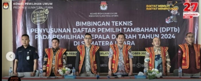 KPU Provinsi Sumatera Utara menyelenggarakan bimbingan teknis (bimtek) terkait penyusunan Daftar Pemilih Tambahan (DPTb) untuk Pilkada 2024 pada 20-21 Oktober 2024 di Baga Resort Hotel, Kabupaten Nias Selatan. Kegiatan ini bertujuan untuk meningkatkan ketepatan dan kualitas data pemilih tambahan dalam rangka menghadapi Pilkada Serentak yang akan dilaksanakan di Sumatera Utara.