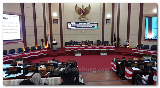 DPRD Medan menggelar paripurna pengumuman perubahan komposisi Alat Kelengkapan Dewan (AKD) di Komisi komisi DPRD Medan dari Fraksi PAN dan Golkar, Senin (17/4/2023). Dalam perubahan tersebut, Mulia Asri Rambe SH (Bayek) ditetapkan menjadi sekretaris Komisi IV DPRD Medan.