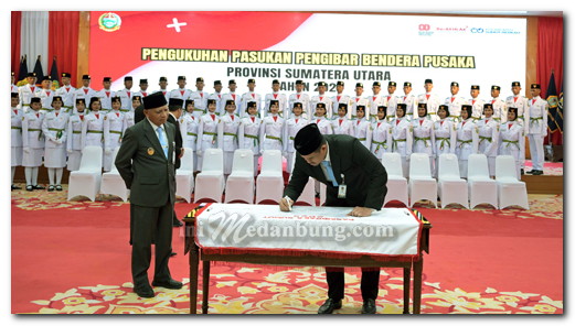 Pengukuhan diakhiri dengan penandatanganan kain putih menandakan bahwa para Paskibraka Sumut 2025 merupakan putra-putri terbaik dari 33 Kabupaten/Kota se-Sumut yang dimulai oleh Gubernur Sumut Bobby Nasution. Wakil Gubernur Sumut Surya, Ketua DPRD Sumut Erni Ariyanti, Sekdaprovsu Togap Simangunsong, Wakapolda Sumut Brigjen Pol. Rony Samtana, Kajatisu Harli Siregar, Inspektur Kodam I/Bukit Barisan (Irdam I/BB) Brigjen TNI Josafath M. Robert, Danlantamal I Belawan Brigjen TNI (Mar) Jasiman Purba, DanLanud Soewondo Kolonel Nav Sonni Benny Simanjuntak. ***