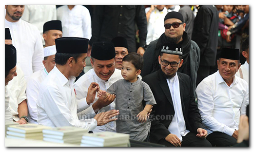 Kedatangan Jokowi disambut ribuan masyarakat mulai dari yang berada di luar masjid sampai dengan jemaah (masyarakat) yang ada di dalam masjid.