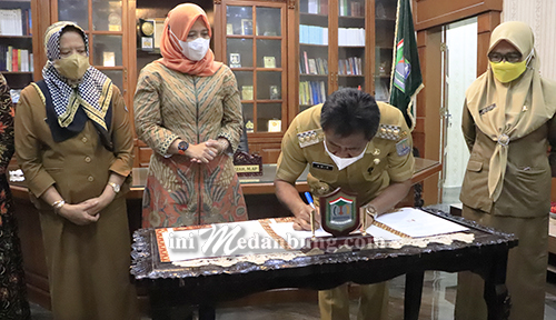 Wali Kota Binjai menandatangani kesepakatan bersama antara Sekolah Tinggi Olahraga dan Kesehatan (STOK) Bina Guna dan Pemko Binjai, di Ruang Kerja Wali Kota, Jalan Jenderal Sudirman No. 6. Senin (10/2/2022). Kesepakatan bersama (MoU) ini terkait pengembangan tri darma perguruan tinggi kurikulum merdeka belajar-kampus merdeka, dan program kerja Wali Kota Binjai.