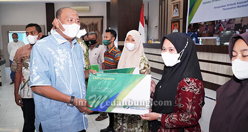 Hal ini ditandai penyerahan secara simbolis Kartu Kepesertaan program BPJamsostek oleh Pelaksana Tugas (Plt) Bupati Langkat H Syah Afandin kepada perwakilan Guru Honorer, di Ruang Pola Kantor Bupati Langkat, Stabat, Jum’at (4/3/2022).