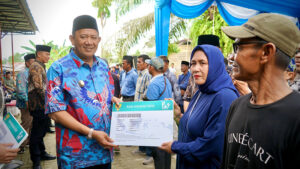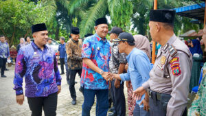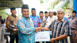 Plt.Bupati Langkat H.Syah Afandin, SH menyerahkan bantuan sosial kepada Bilal Mayit, Penggali Kubur dan Abang Becak se Langkat Hilir bertempat di masjid AL – Makmur Dusun I Sumur Boor Desa Tebing Tanjung Selamat, Kecamatan Padang Tualang, Kamis 14 September 2023.