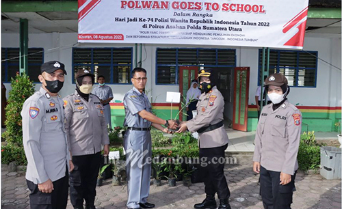 Waka Polres Asahan Kompol Sri Juliani Siregar SH melaksanakan kunjungan SMP N.6 Kisaran Jalan Latsitarda Kelurahan Kisaran Naga Kecamatan Kisaran Timur Kabupaten Asahan dalam rangka peringatan Hari Jadi Polwan Ke 74 Tahun 2022, Senin (08/8/2022).